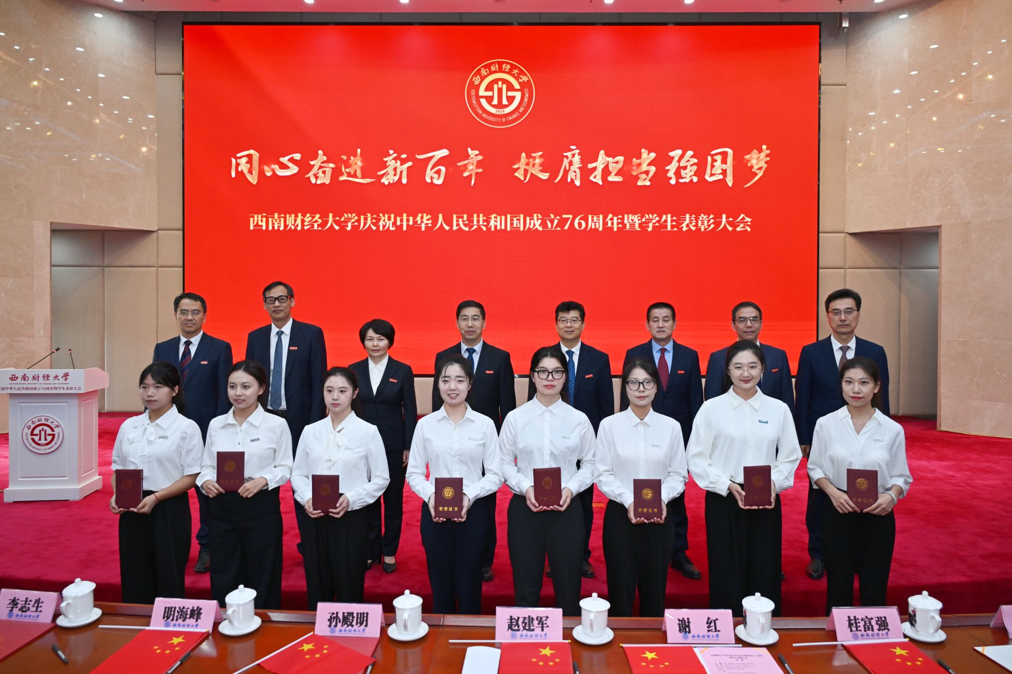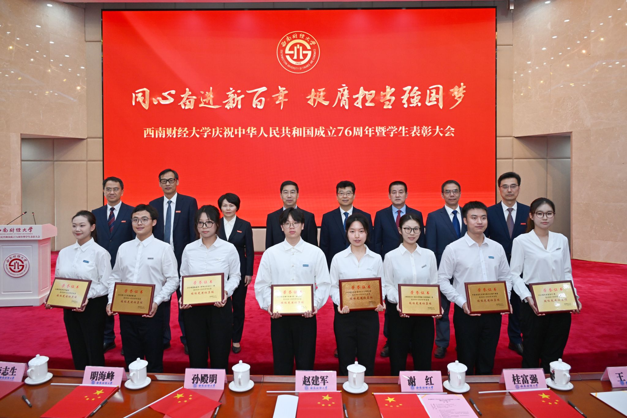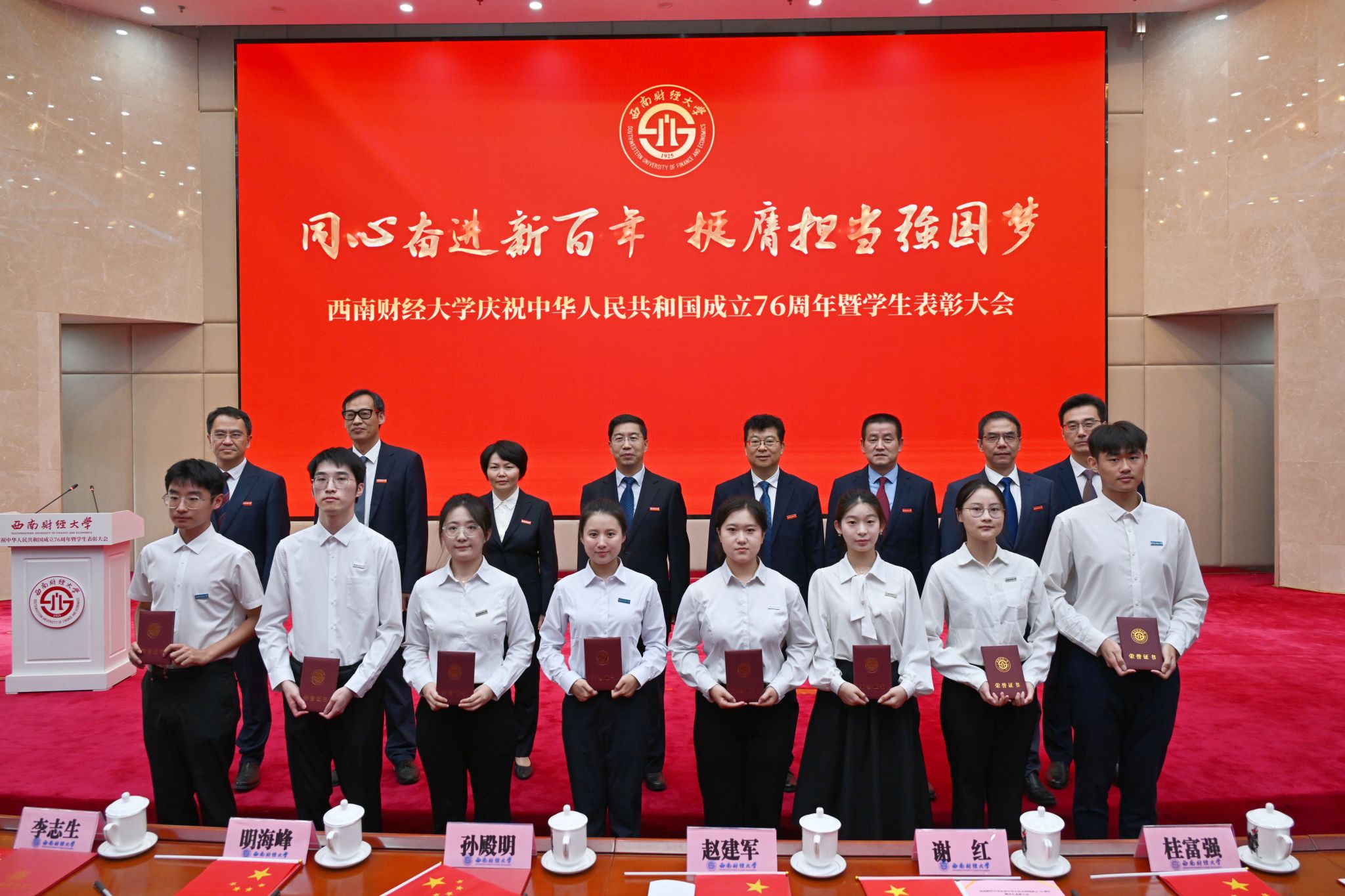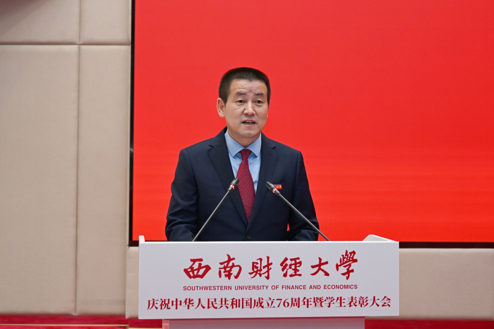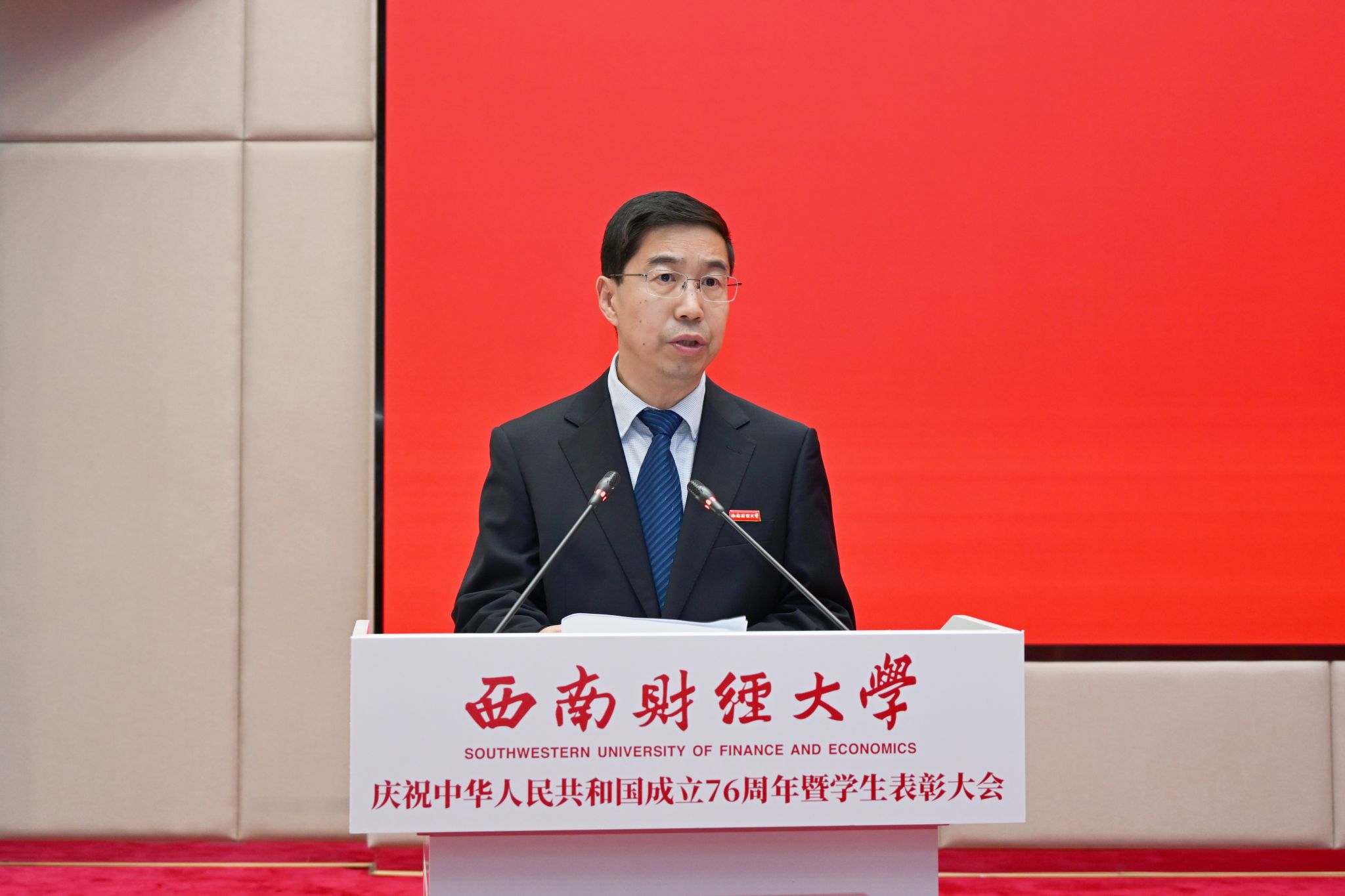党委书记赵建军代表学校向全校师生员工致以节日问候,向受到表彰的先进学生集体和优秀学生个人表示热烈祝贺。他指出,新中国成立76年来,中国共产党带领全国各族人民同心同德、自立自强,新中国日益走近世界舞台中央、中华民族伟大复兴迎来光明前景。西南财大始终紧跟国家发展战略、紧扣教育发展机遇、紧贴时代发展脉搏,担当奋进,集聚起面向新百年、开启新征程、迈向新起点的坚实底气。
