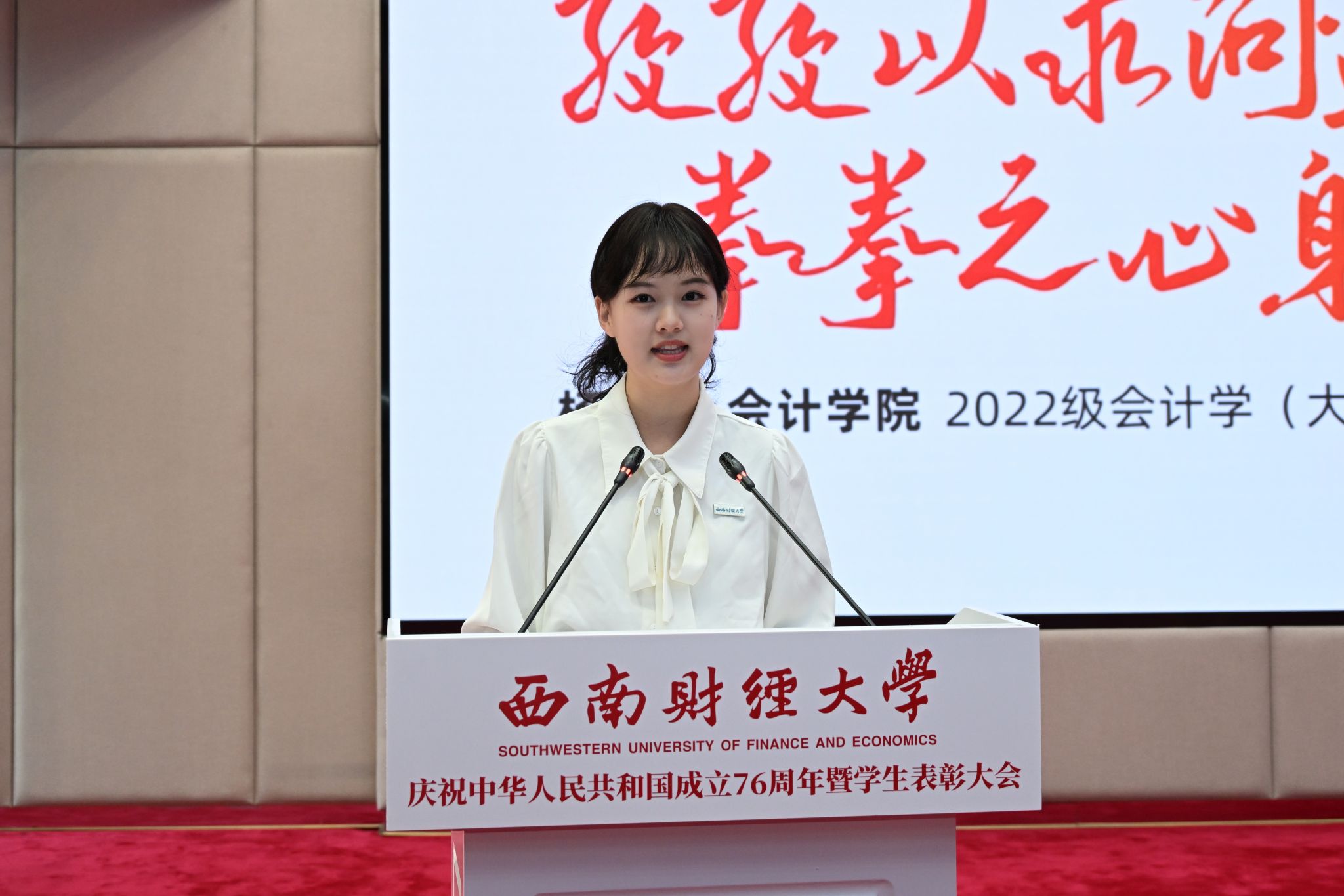 受表彰三好学生代表贾翔斐、优秀学生干部代表杨景茹、先进班集体学生代表叶彦炫结合自身学习生活经历分享交流先进事迹,号召广大西财青年传承“经世济民、孜孜以求”大学精神,把个人理想融入民族复兴的伟大征程,以实际行动为中国式现代化贡献青春力量。